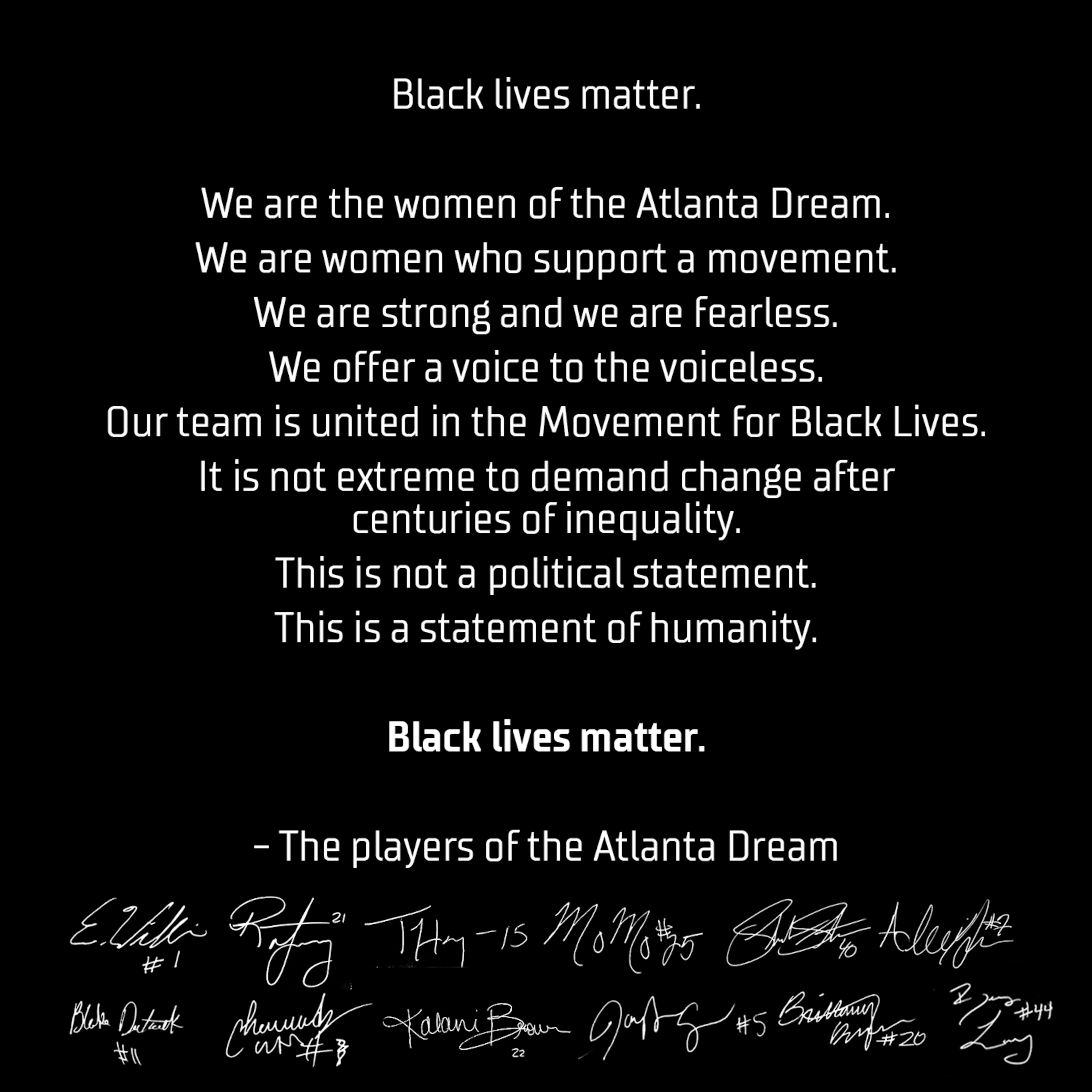 Things looked and felt different for the Dream in 2020, coming off a season of seven wins. Off the court, nationwide demonstrations rallying against police brutality took hold. Dream players signed and shared an open letter opposing a team co-owner, then-U.S. Sen. Kelly Loeffler, and her objections to the WNBA’s involvement in the Black Lives Matter movement.